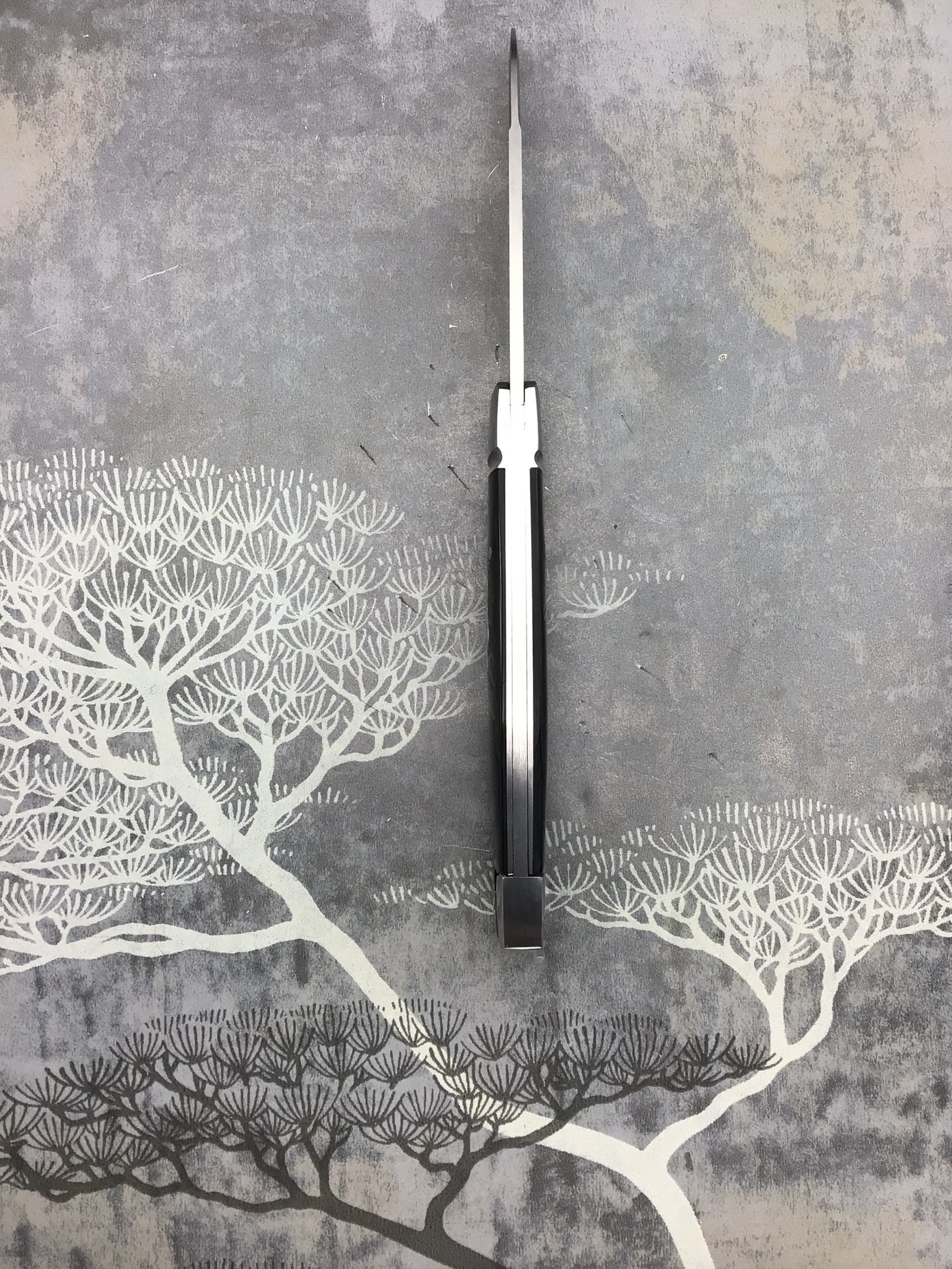 The knife features beautifully polished Café Buffalo horn scales, offering rich depth and natural character. All metal components—including the bolsters, liners, backspring, and shield—are crafted from 416 stainless steel, giving the knife a clean, cohesive look with excellent durability.