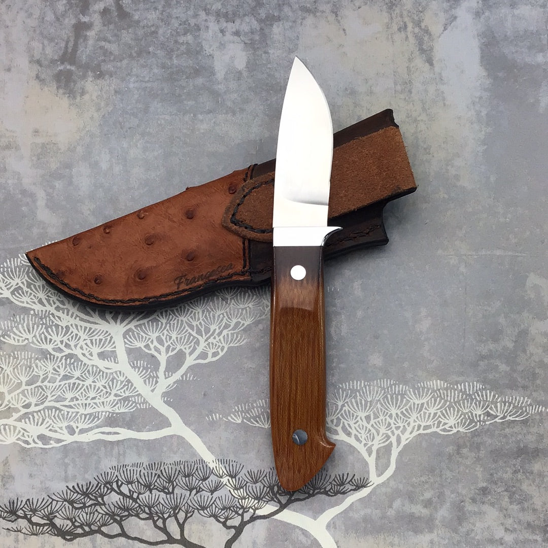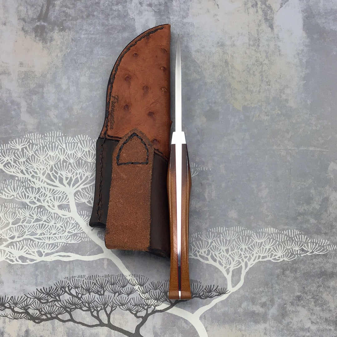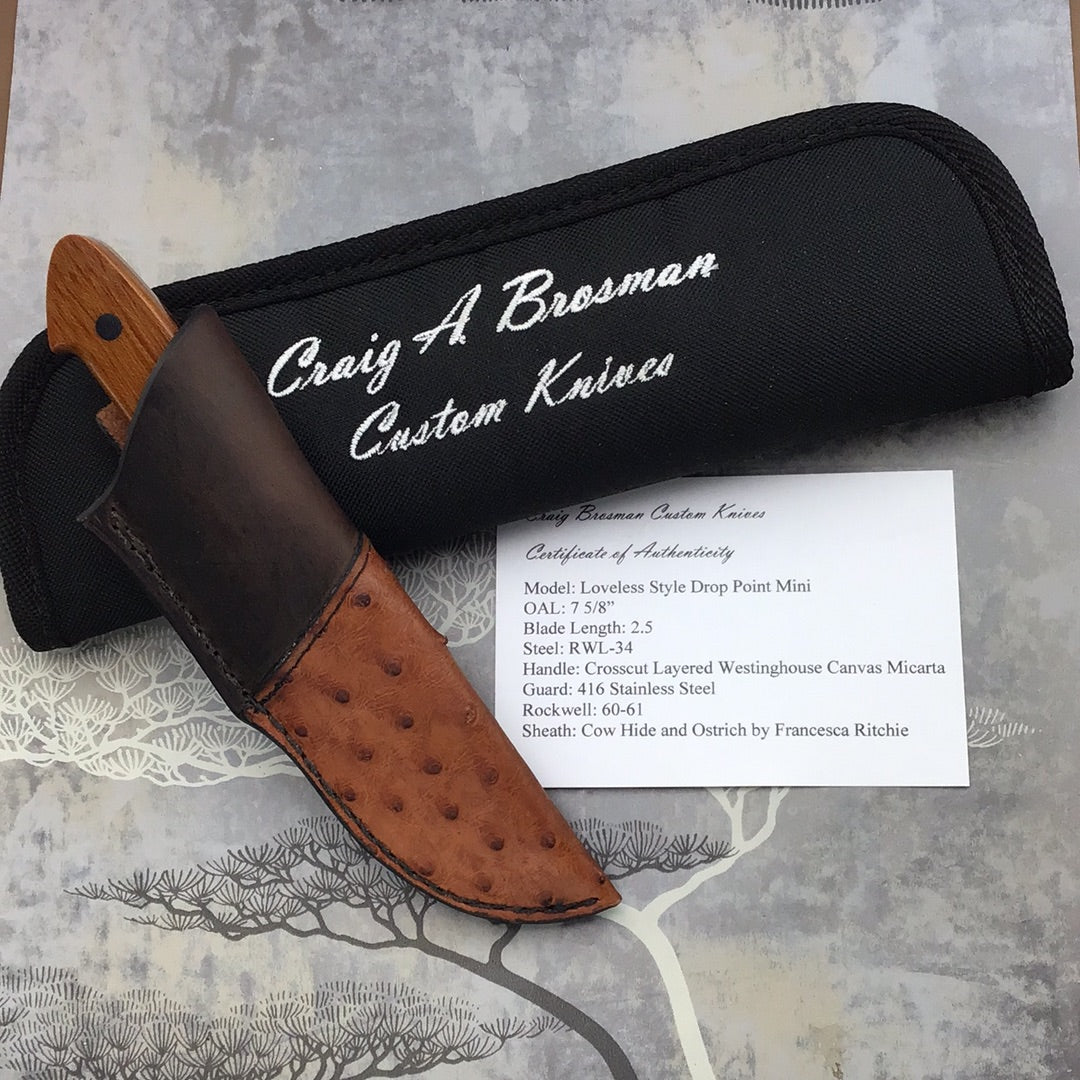 Craig Brosman “Loveless Style” Drop Point Hunter. Crosscut layered Westinghouse canvas Micarta handle. 416 SS guard. RWL-34 Steel. Custom sheath in cowhide and Ostrich by Francesca Ritchie. Outstanding craftsmanship from Craig. SUPER CLEAN KNIFE. OAL 7 5/8, Handle 5 1/8, Blade 2 1/2 RWL-34
