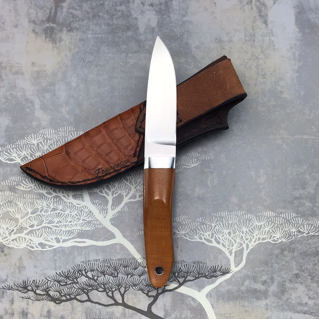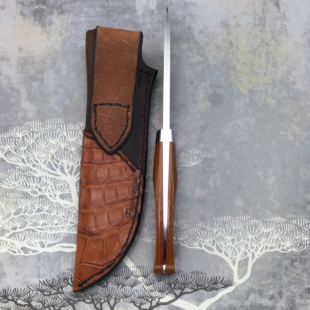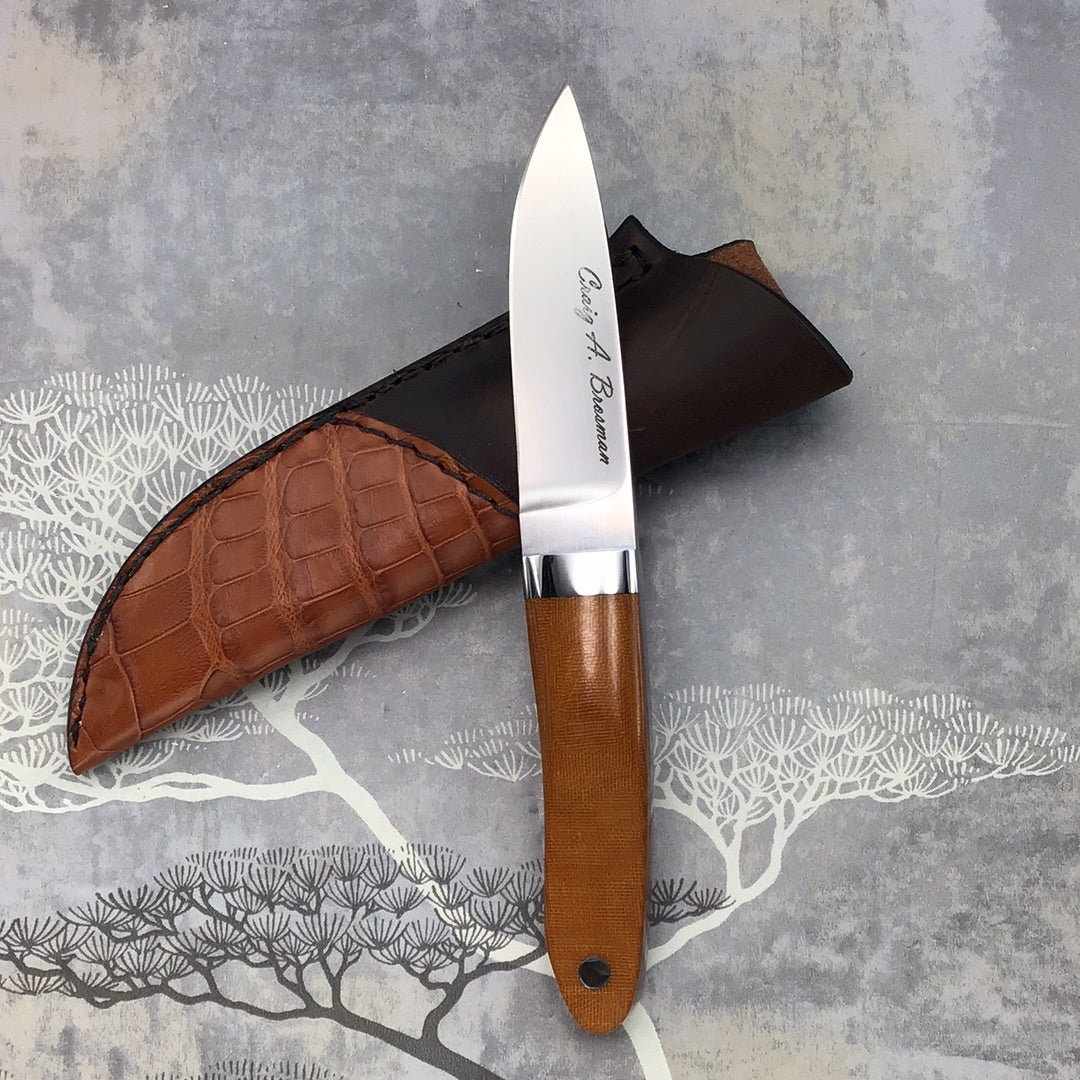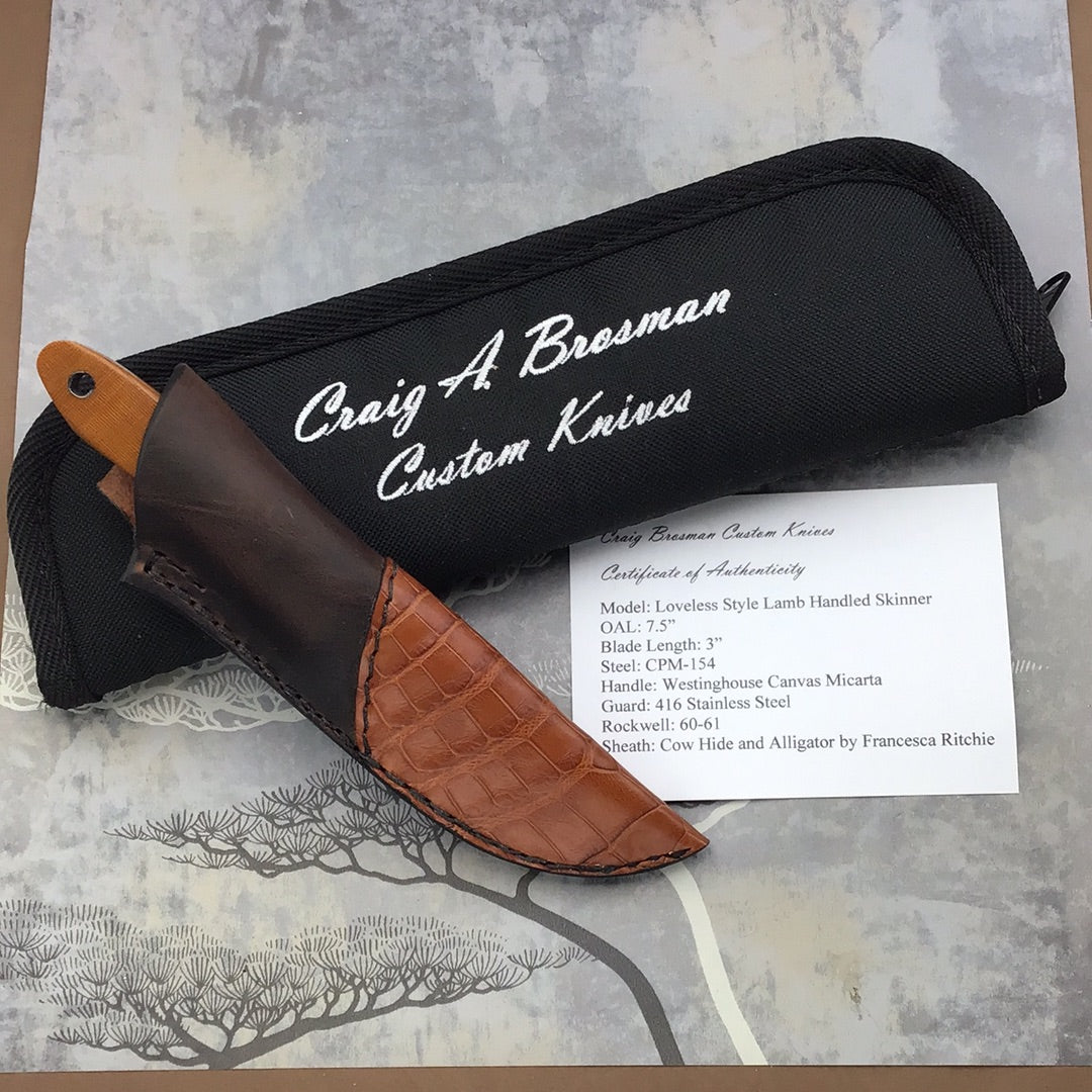 Craig Brosman “Loveless Style” Lamb Skinner knife. Beautiful Westinghouse Canvas Micarta Handle. 416 SS guard. CPM154 Steel. Custom Sheath in Cow Hide and Alligator by Francesca Ritchie. Outstanding craftsmanship from Craig. SUPER CLEAN KNIFE, OAL 7 1/2, Handle 3 3/4, Blade 3 3/4 CPM154