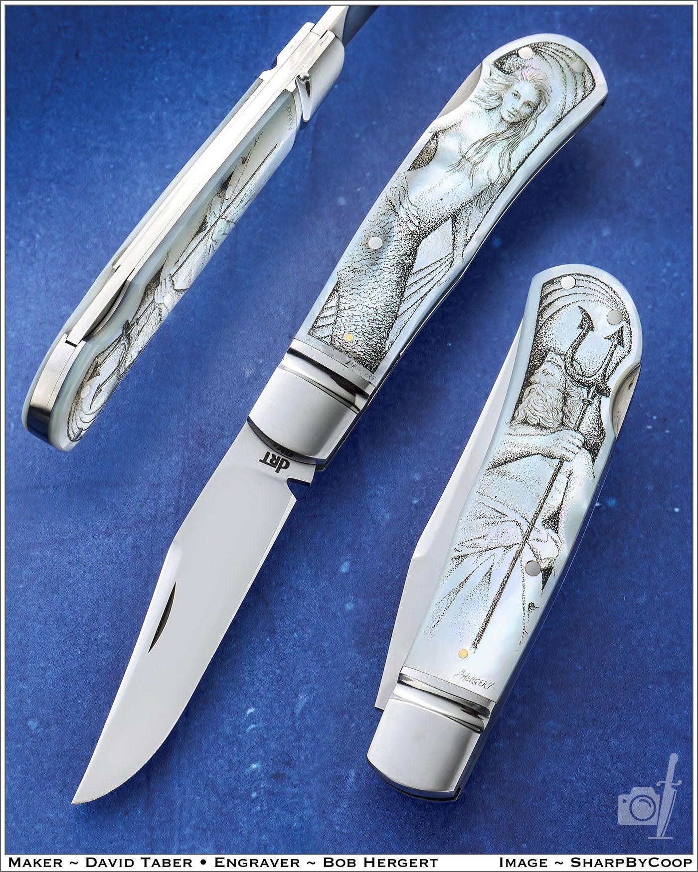David {dr.t} Taber "Backpocket" Lockback Slipjoint with Absolutely Beautiful Mother of Pearl and Scrimshaw By Bob Hergert. This knife by Dave is perfect in fit and function. A real master piece. The scrim work by Bob Hergert makes is a real Grail knife for any collection. Bolsters are 416SS {rounded and fluted}. Liners and back spring are 416SS. Comes with a DR. T KNIVES padded zippered case. OAL 7 3/8, Closed 4 1/4, Blade 3 1/8 CPM154. Photo By SharpByCoop (Jim Cooper