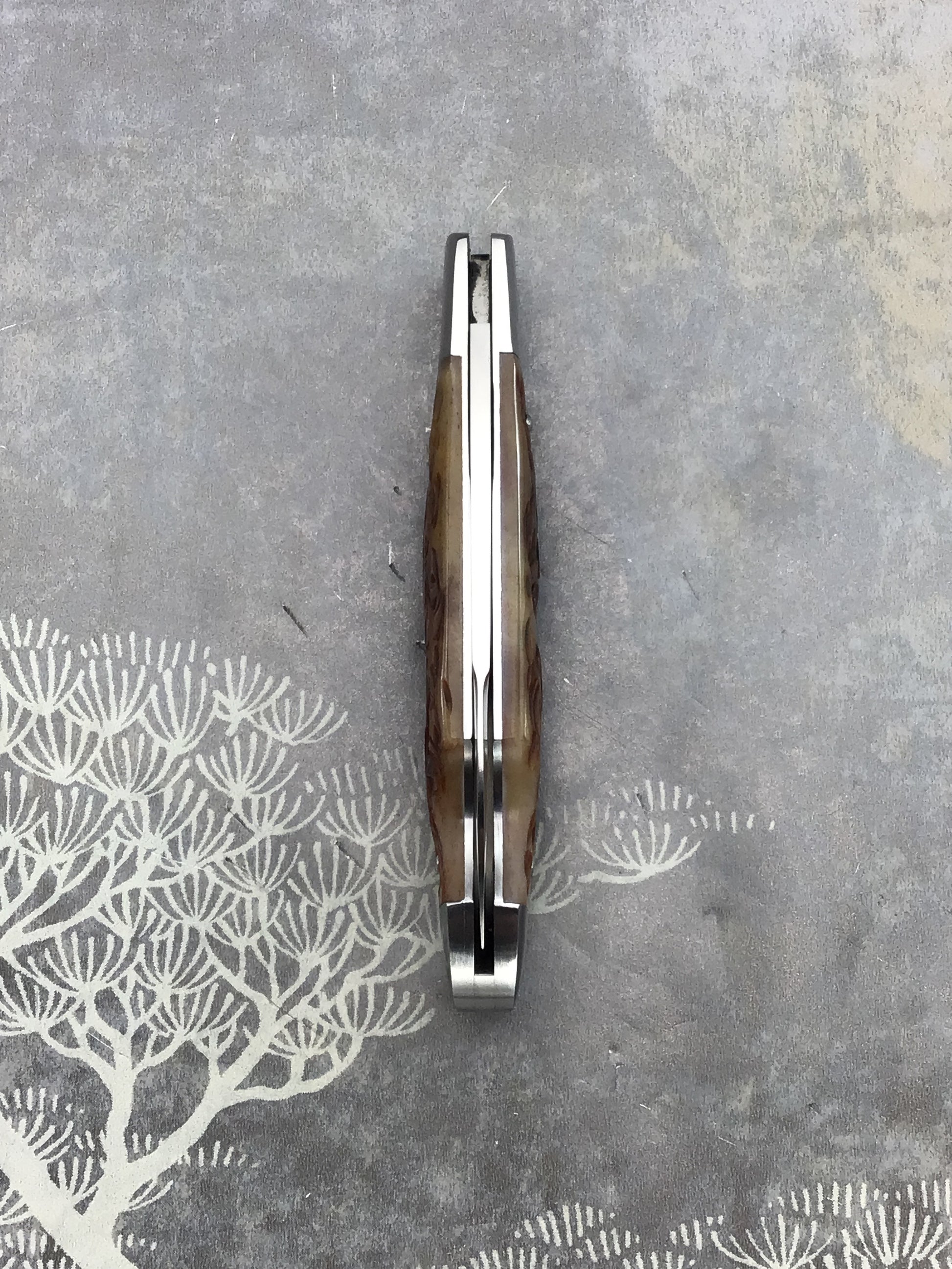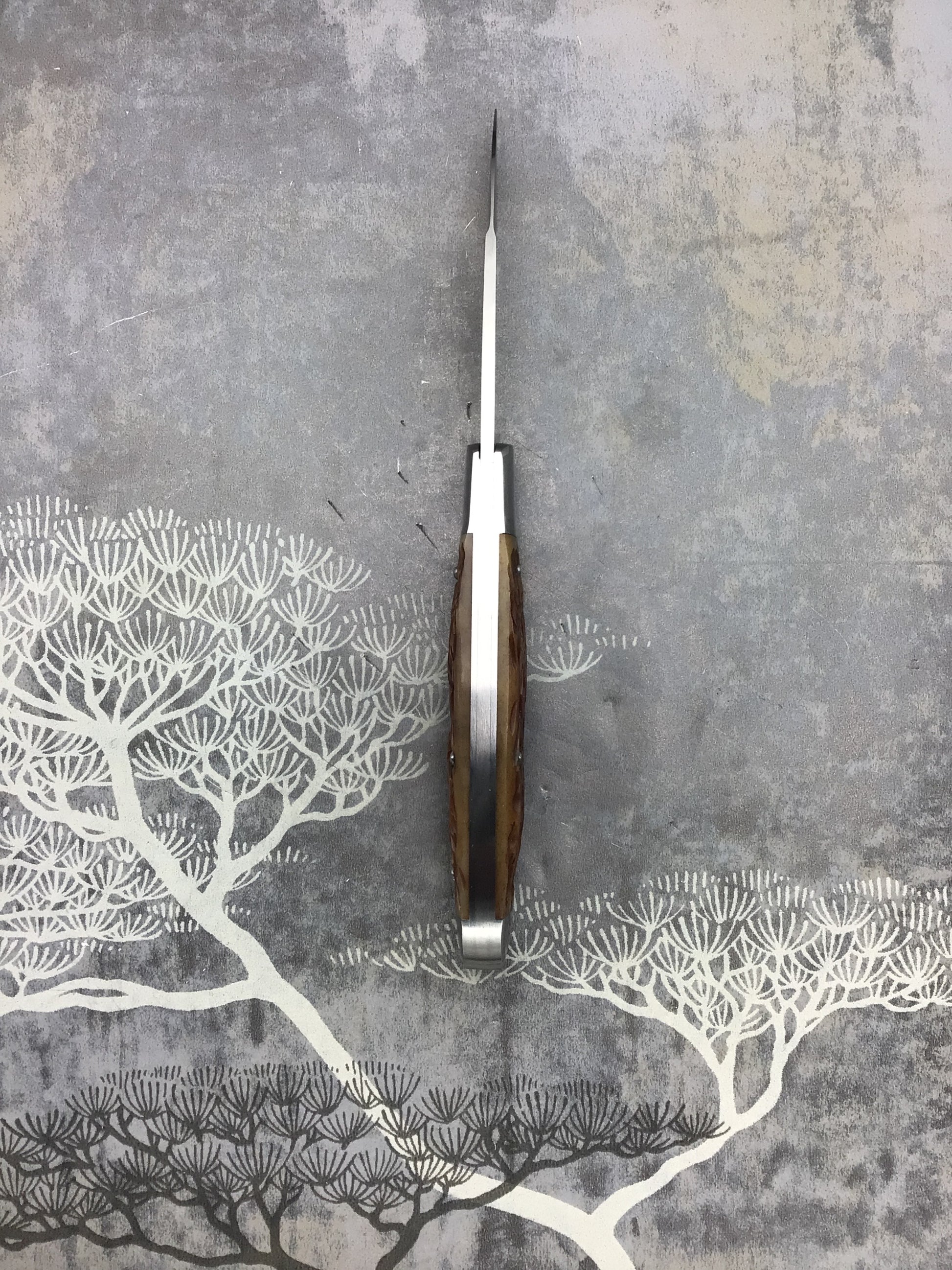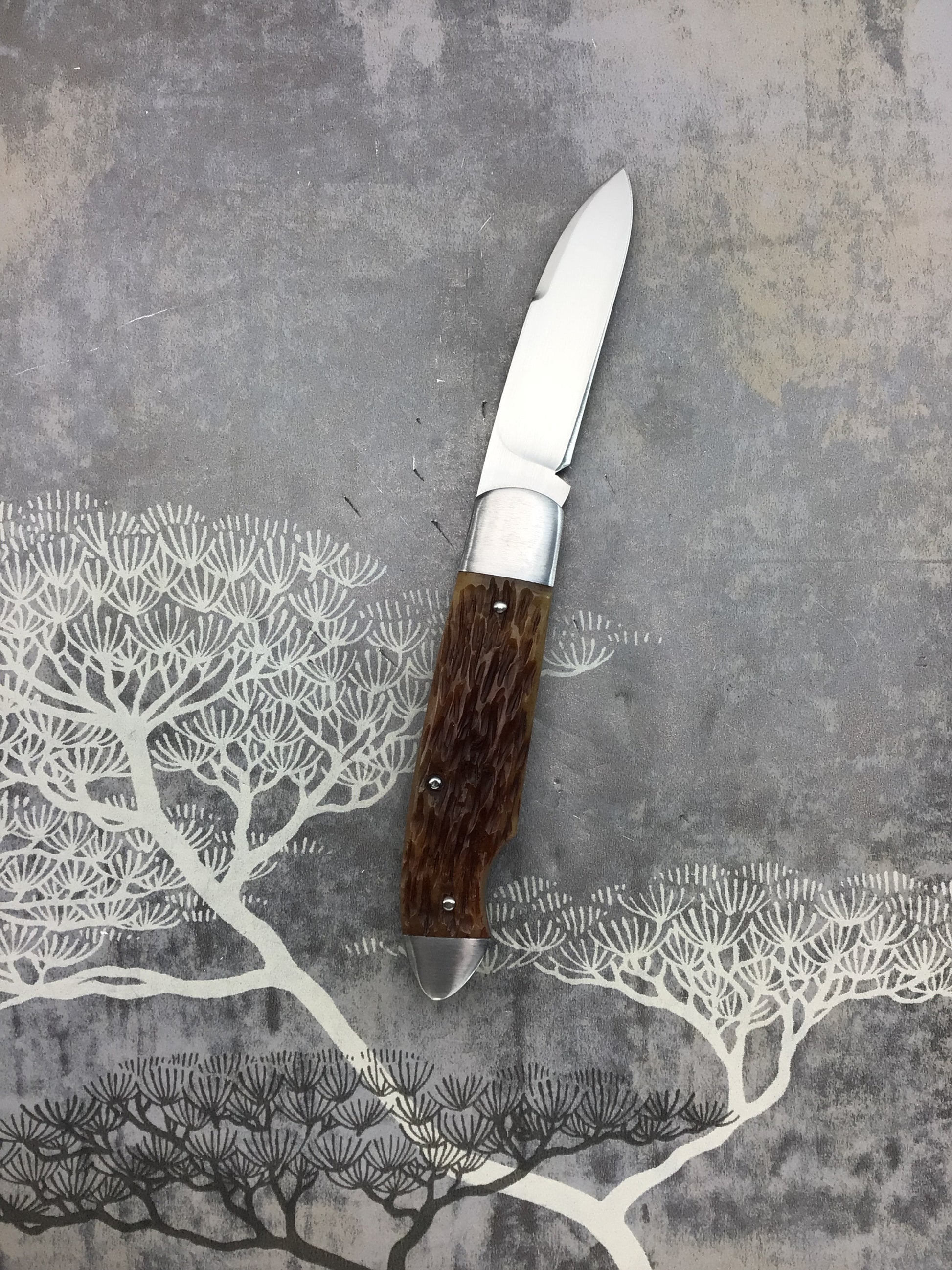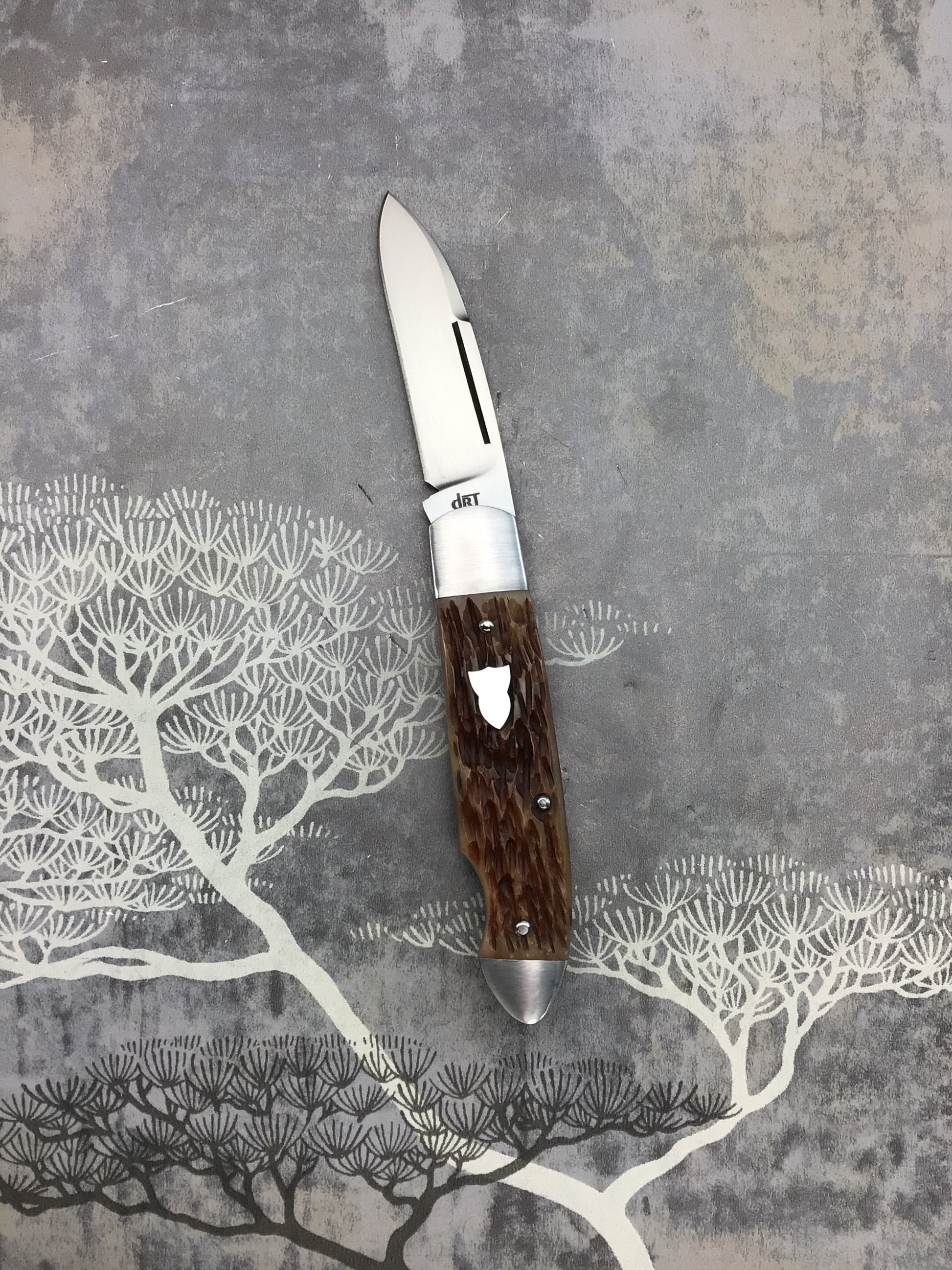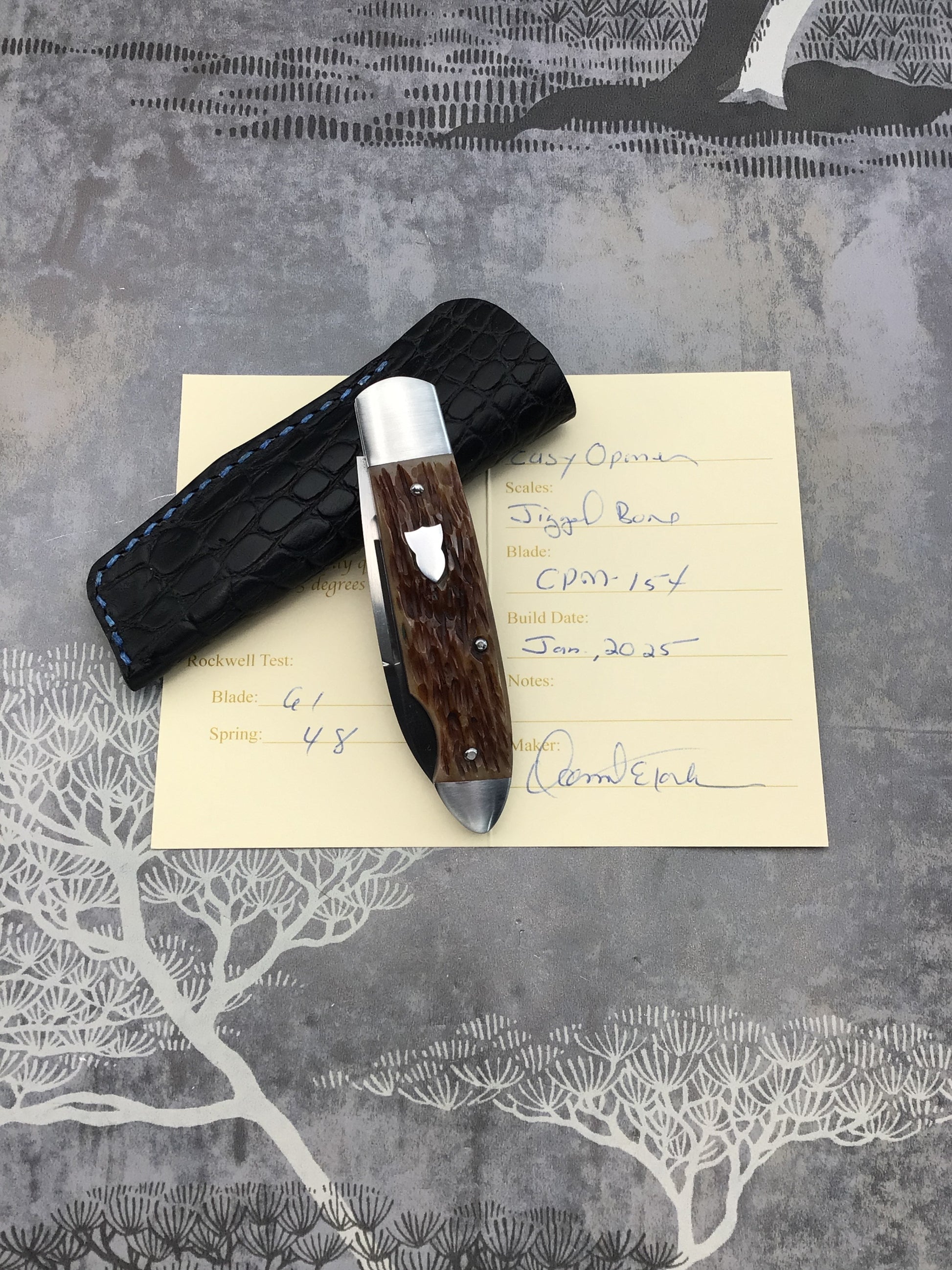 David (dr.t) Taber “EZ Opener Jack” Slipjoint. Comes with fantastic jigged bone scales by Dave. 416 SS bolsters, liners, Backspring and shield (acorn style). OAL 6 1/4, closed 3 1/8, blade 3 1/8 CPM154 with long pull. Outstanding fit, finish and function. Fresh off the bench a home run from Dave.