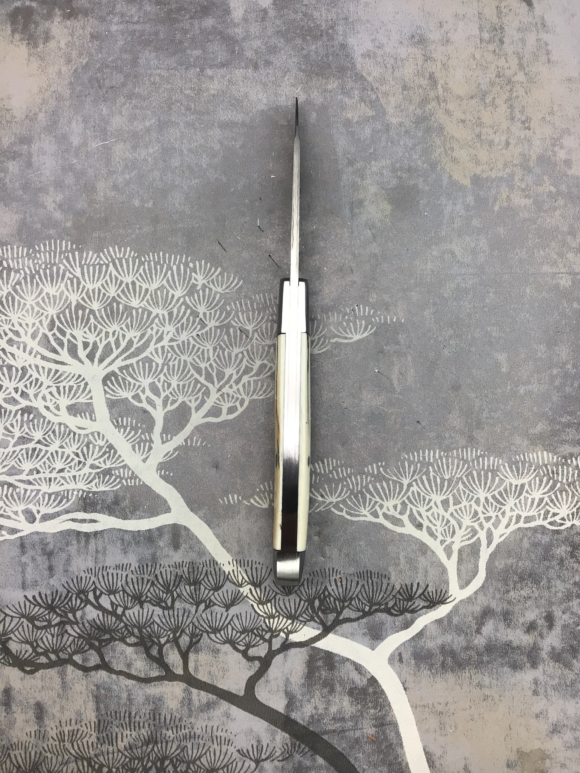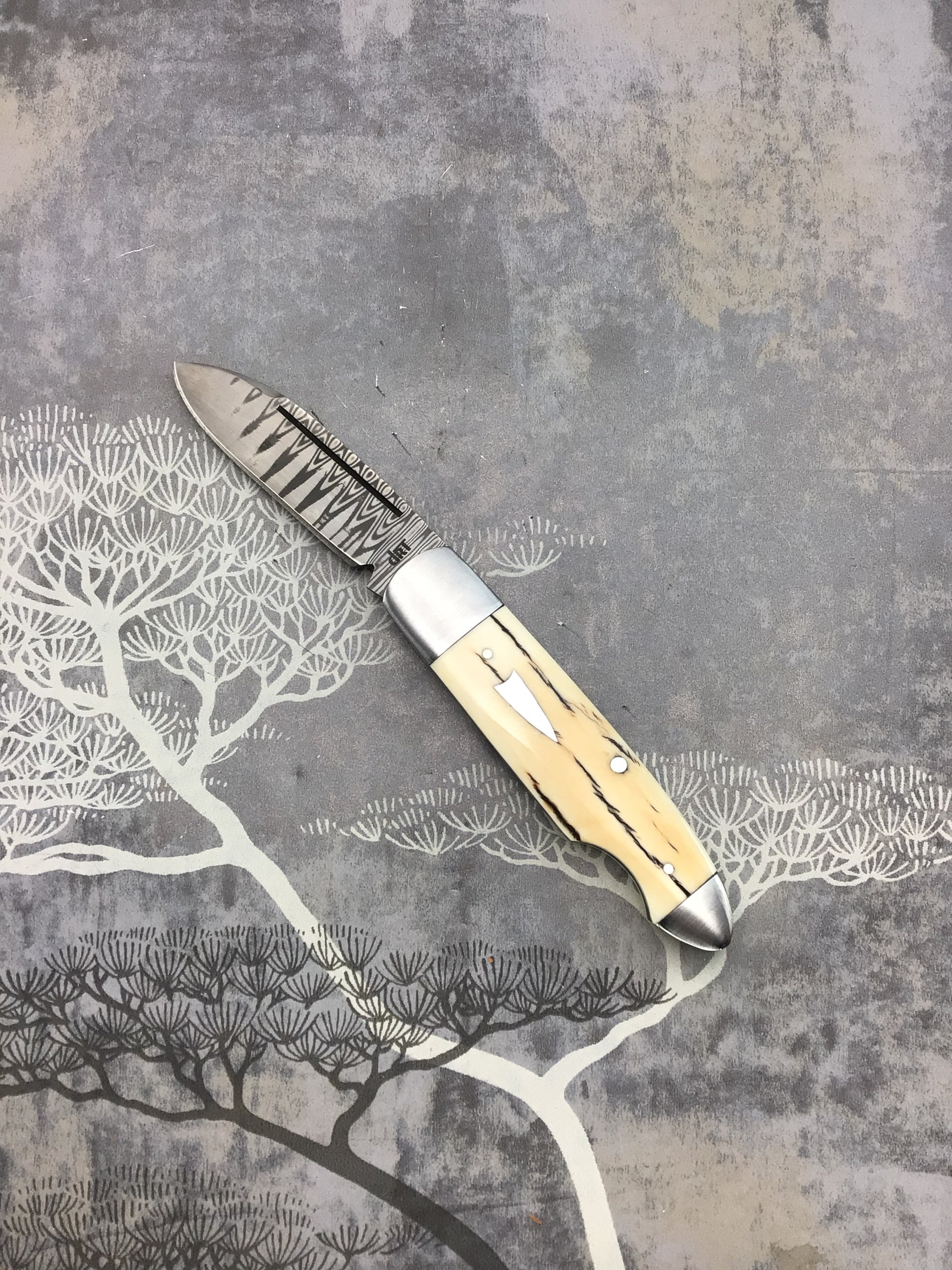 David “dr.t” Taber “EZ Opener Jack” with Antique Bark E Ivory scales. 416 SS bolsters, liners, back spring and shield. OAL 6 3/8, Closed 3 5/8, Blade 2 3/4 Damacore Damascus with DRT ETCH. Beautiful knife with excellent fit, finish and function.