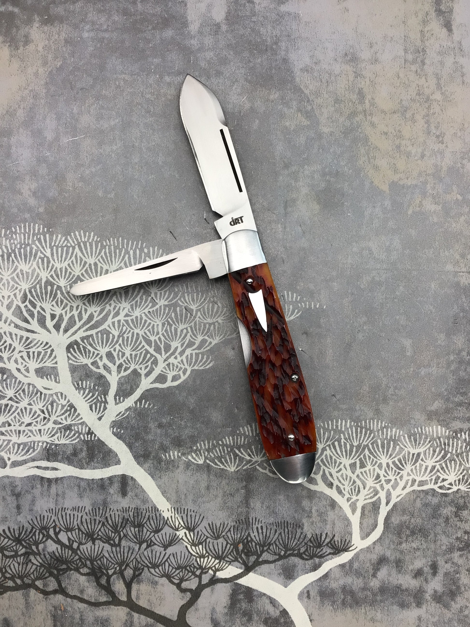 David “dr.t” Taber PROTOTYPE “Harness Jack” slipjoint with absolutely beautiful jigged bone scales by Dave. 416SS bolsters, caps, liners, back spring and shield. Shield and blade swedge are high polished. Dave did a masterful job on the jigged bone, it is full of different colors with great jigging. OAL 6 1/2, Closed 3 5/8, Blade 2 7/8 CPM154 with high polish on swedge, Punch 2 1/4 CPM154. DRT Etch. The fit, finish and function is outstanding.