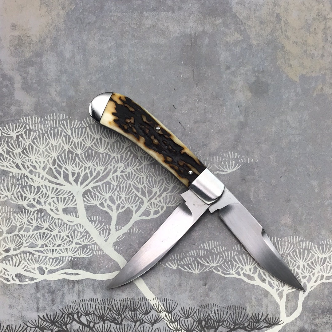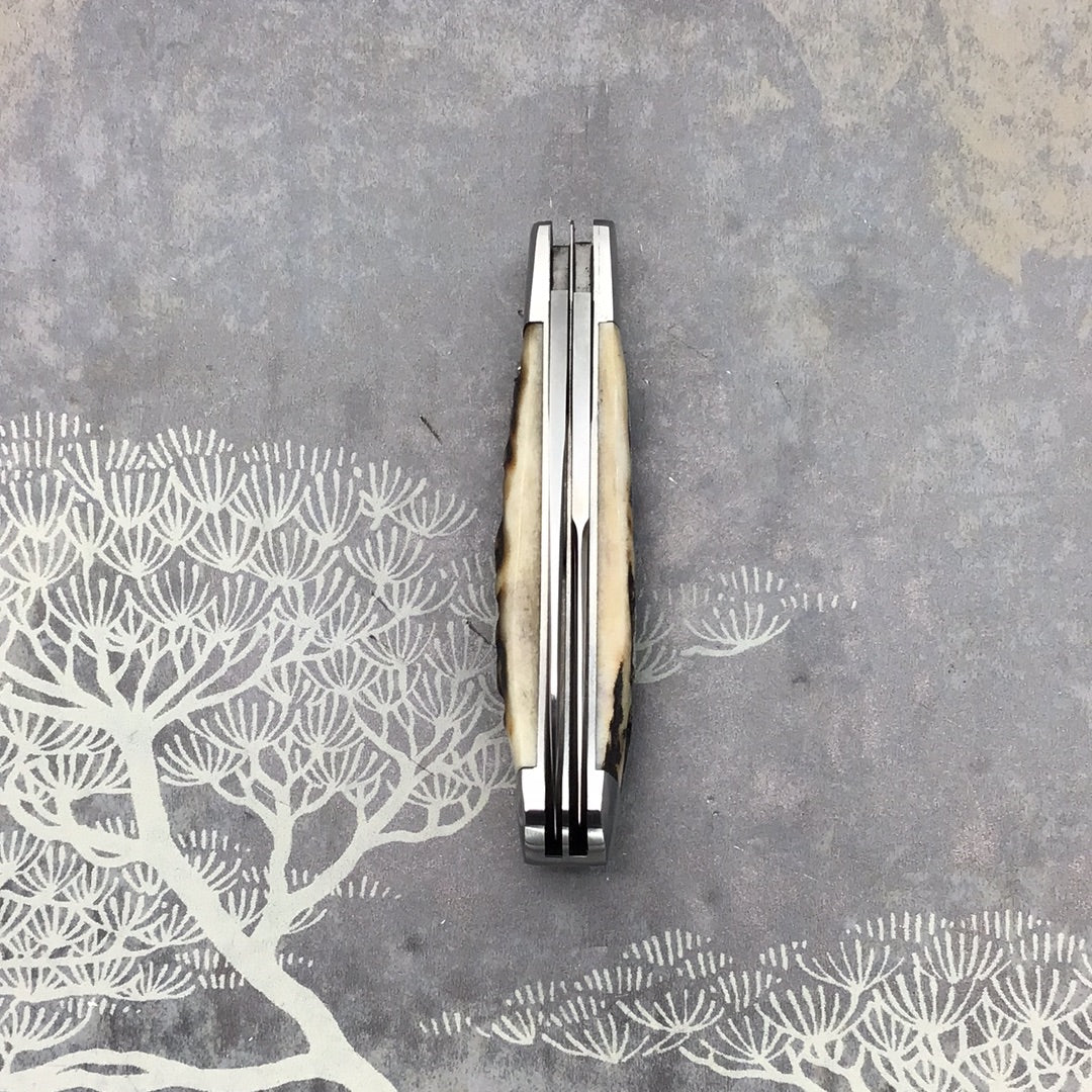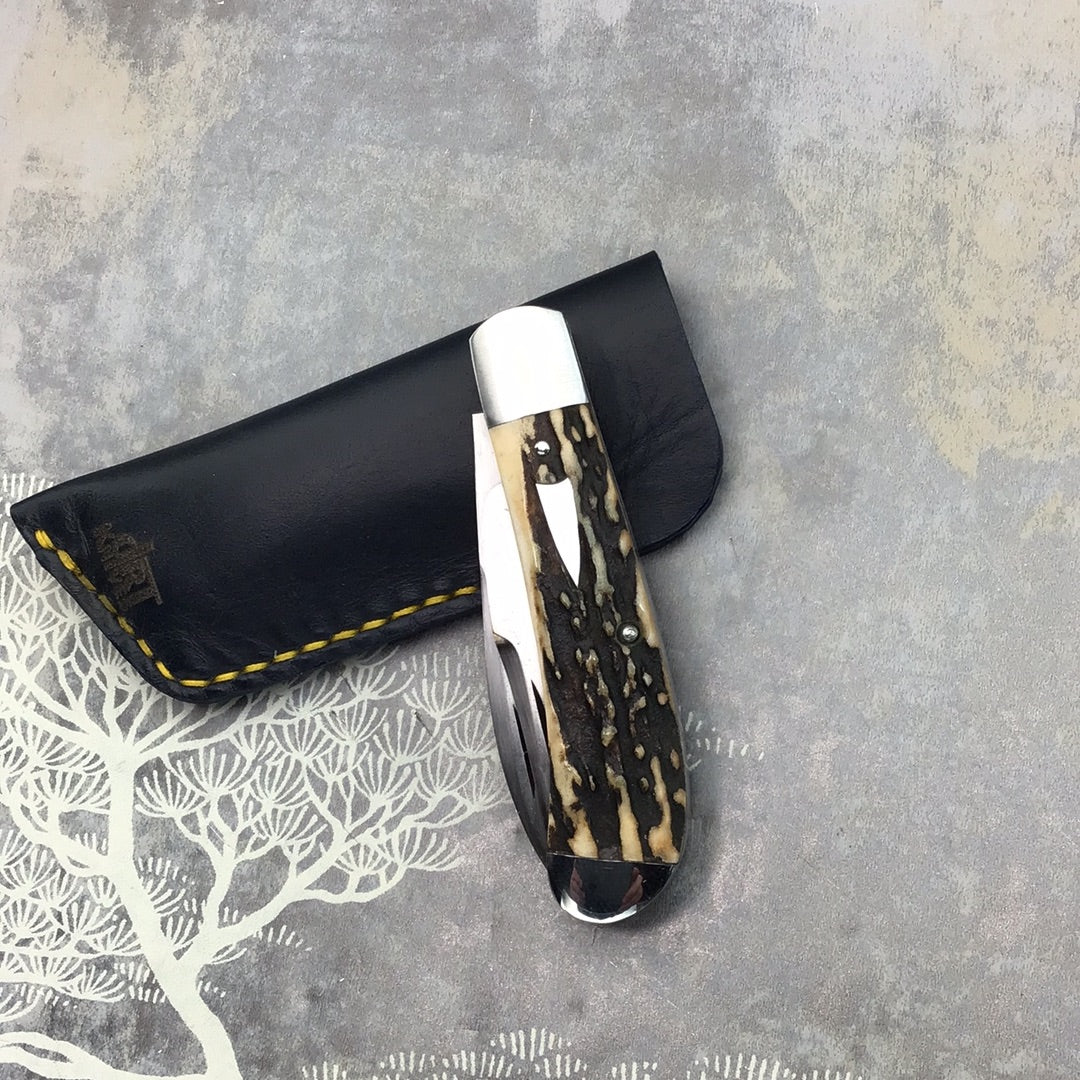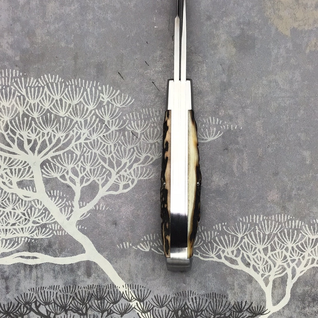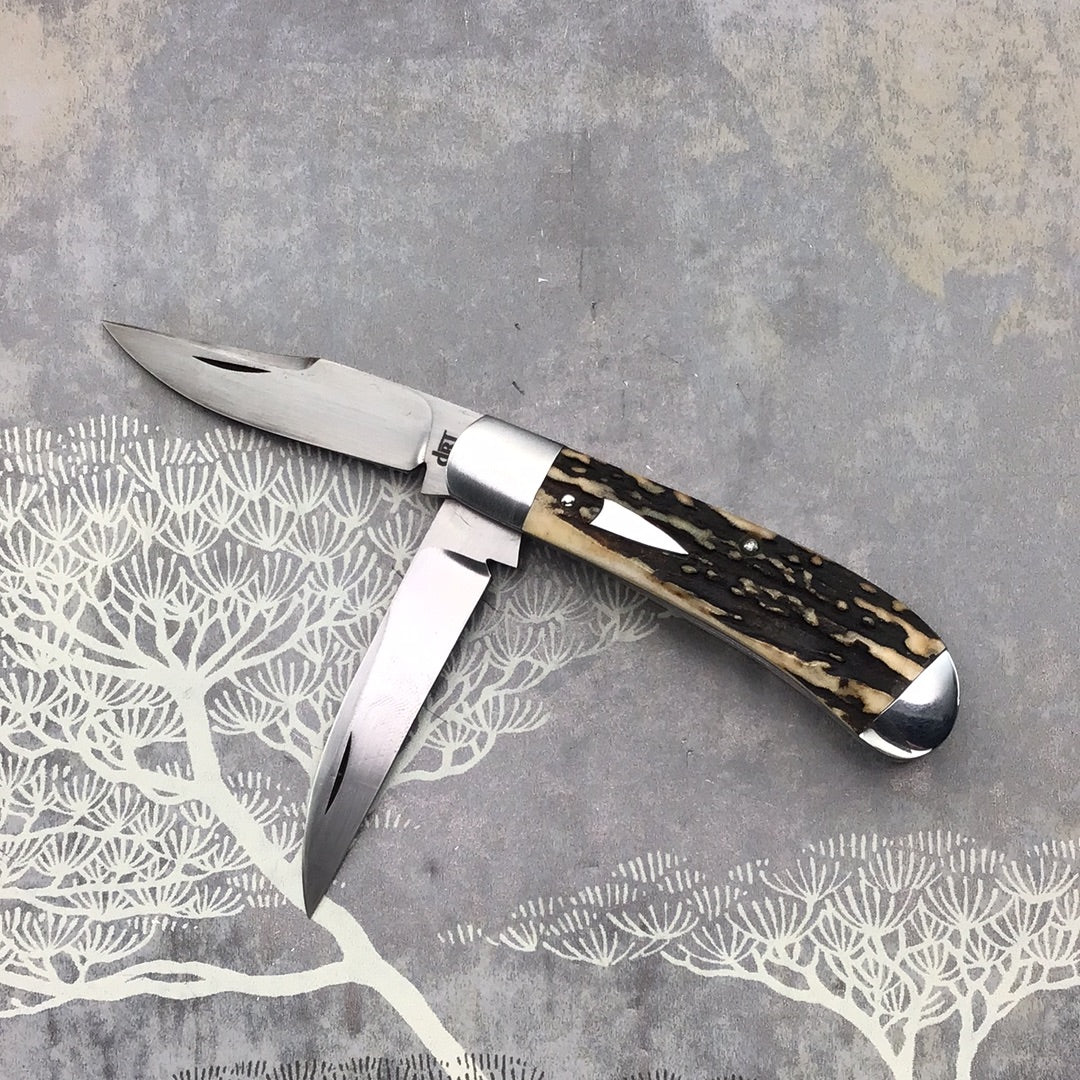 David (dr.t) Taber “Warncliffe Trapper” with AWESOME Natural Sambar stag scales and Arrow head shield. 416 SS Bolsters, liners, back spring and shield. DRT etch. OAL 6 1/8, Closed 3 1/3, Blades 2 5/8 and 2 1/2 CPM154. Excellent fit and finish