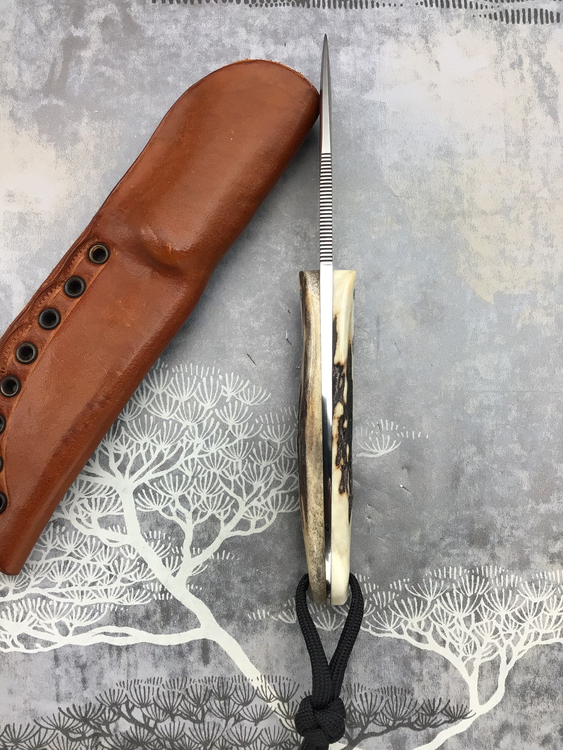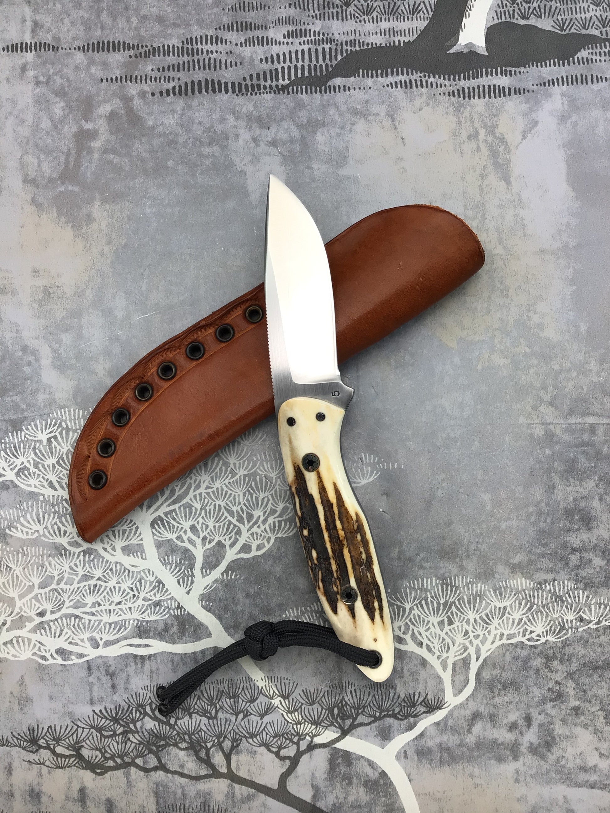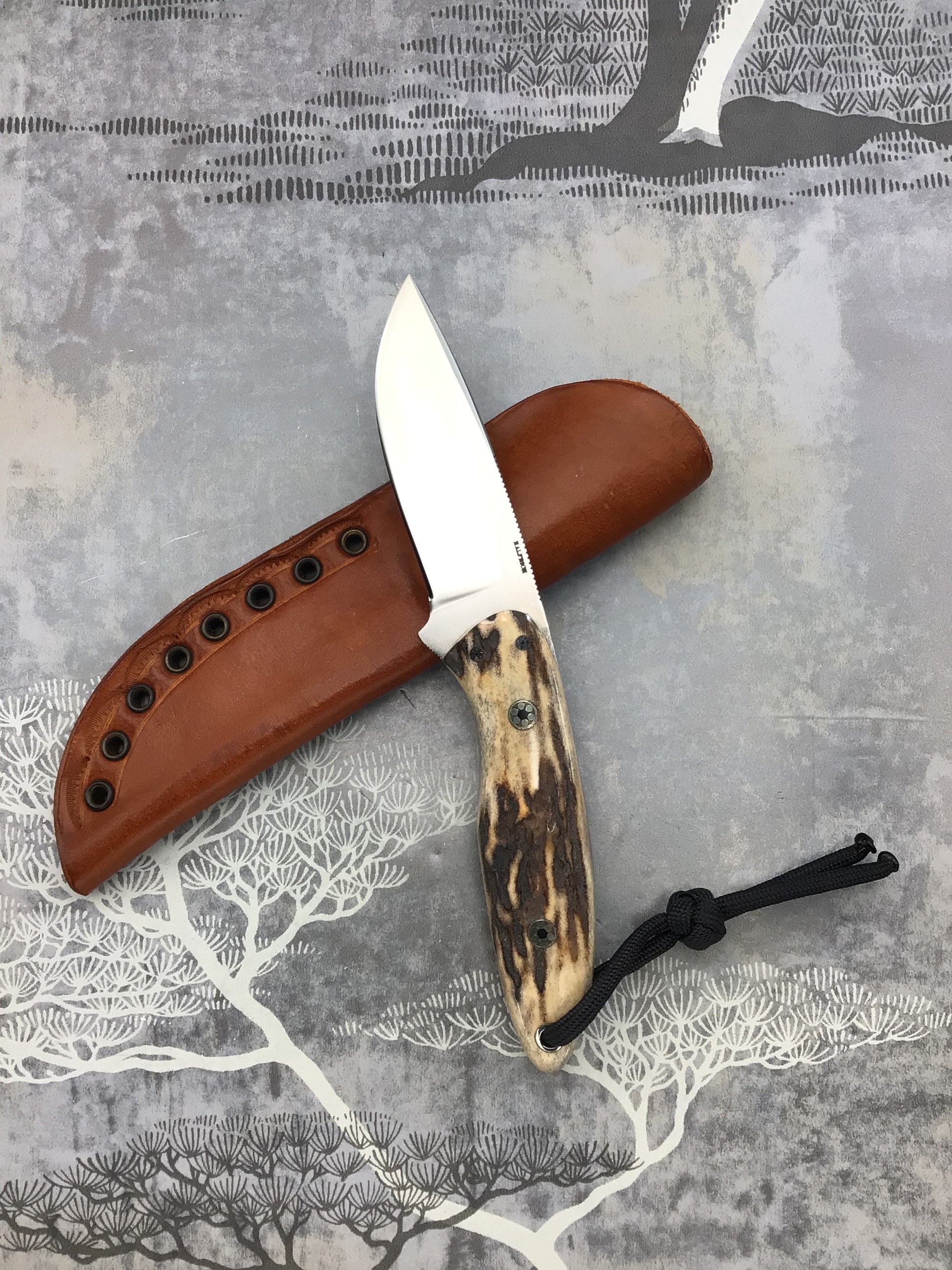 Jerry Halfrich “Texas Hunter” with some beautiful Sambar Stag handles. OAL 7 3/8, Handle 4 1/8, Blade 3 1/4 CPM154. Hand made leather sheath by Jerry.
