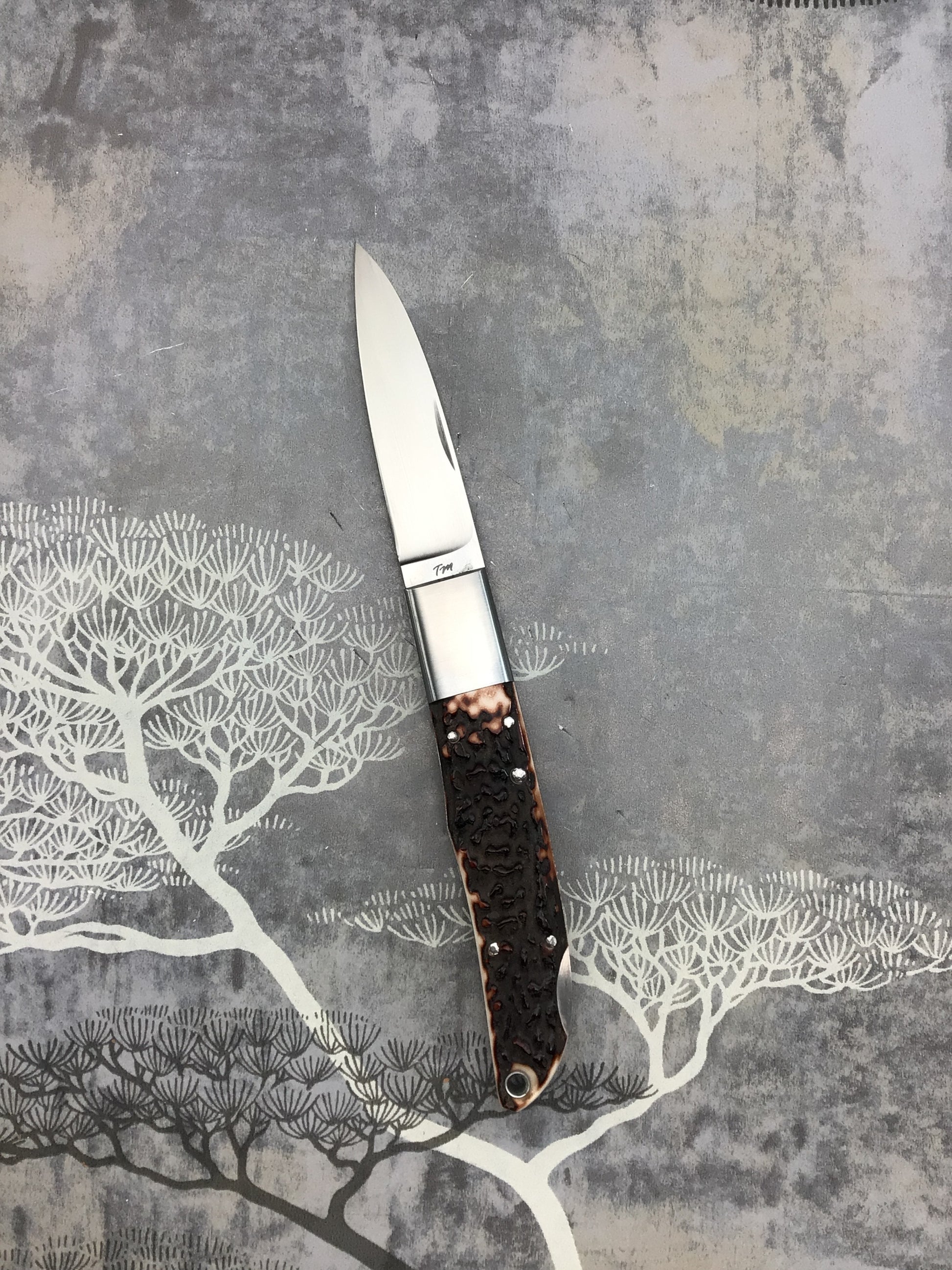 Takeshi Matsusaki “City Knife” with outstanding Amber Stag Scales. A “Ryuichi Kawamura pattern.” and is a Lockback. 416Ss bolsters, liners and back spring. OAL 7 3/8, Closed 4 1/8, Blade 3 1/4 CPM154. TM etch. Super nice knife