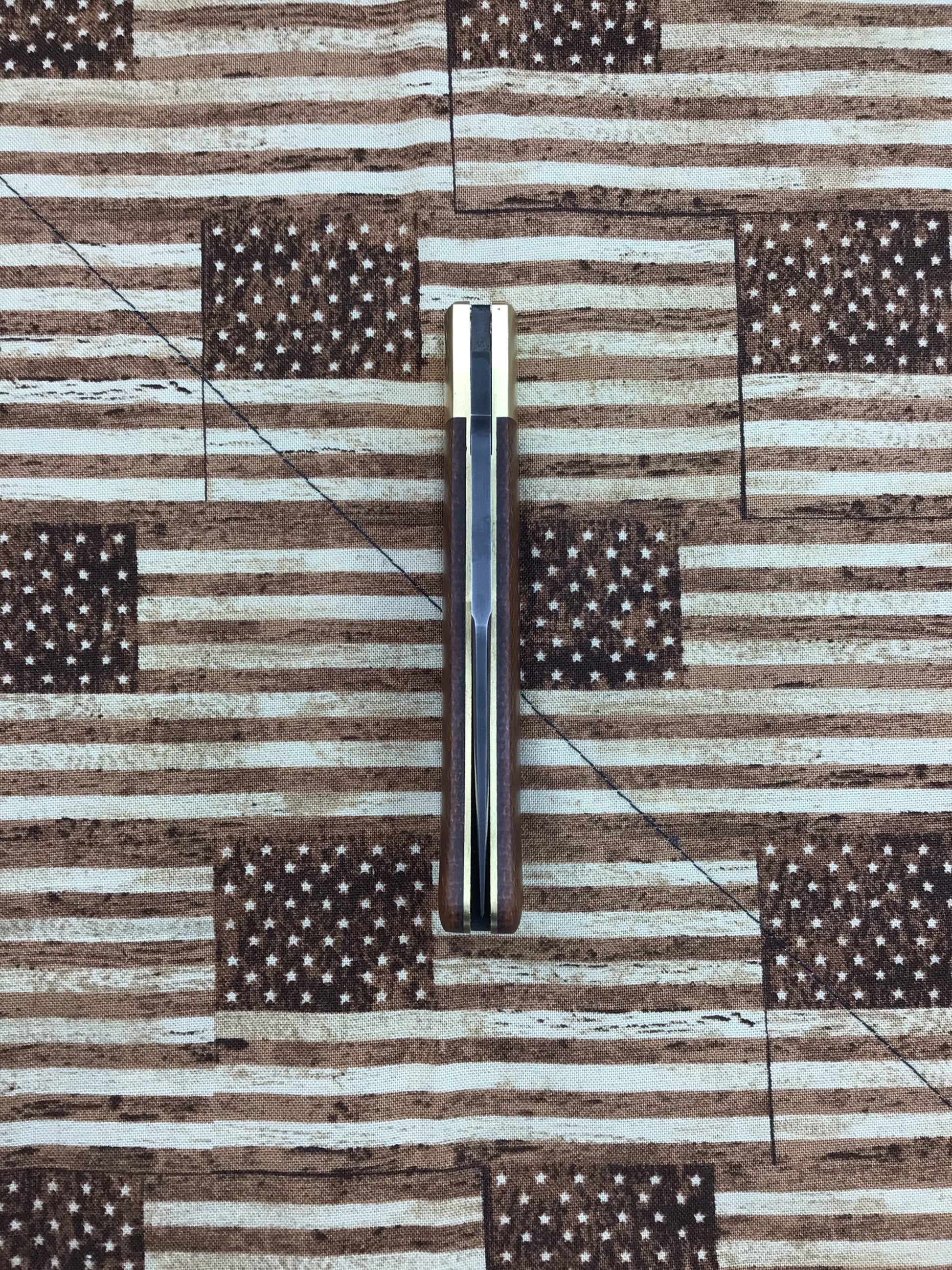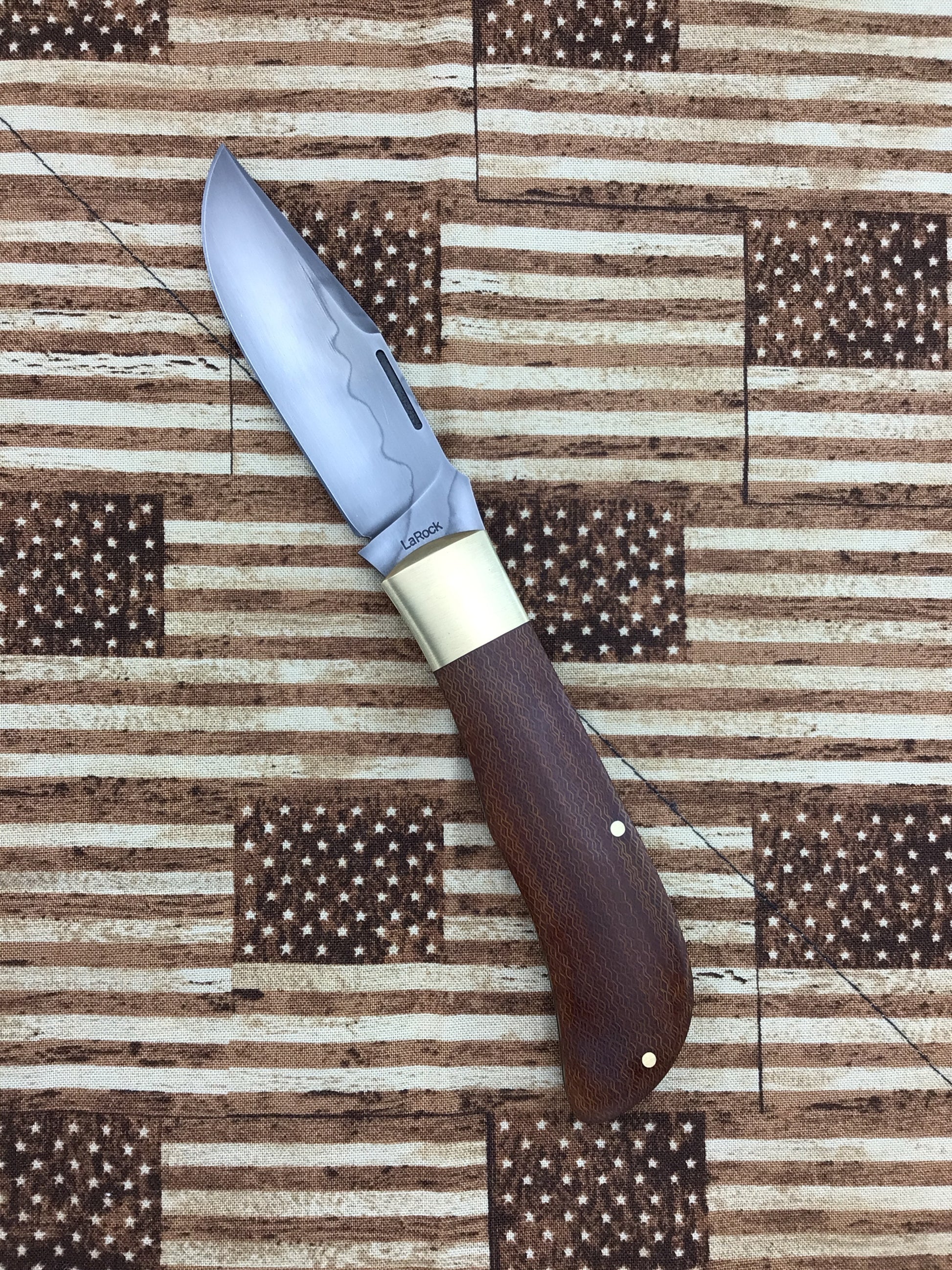 Tracy LaRock “Old School” Timberjack Slipjoint with crosscut canvas Micarta scales. This knife has Brass bolsters, liners and pins. OAL 7 5/8, Closed 4 1/4, Blade 3 3/8 of W-2 steel with a hammon. A great pattern from Tracy, it’s fits your hand like a glove. This knife will do everything needed. Fantastic Craftsmanship.