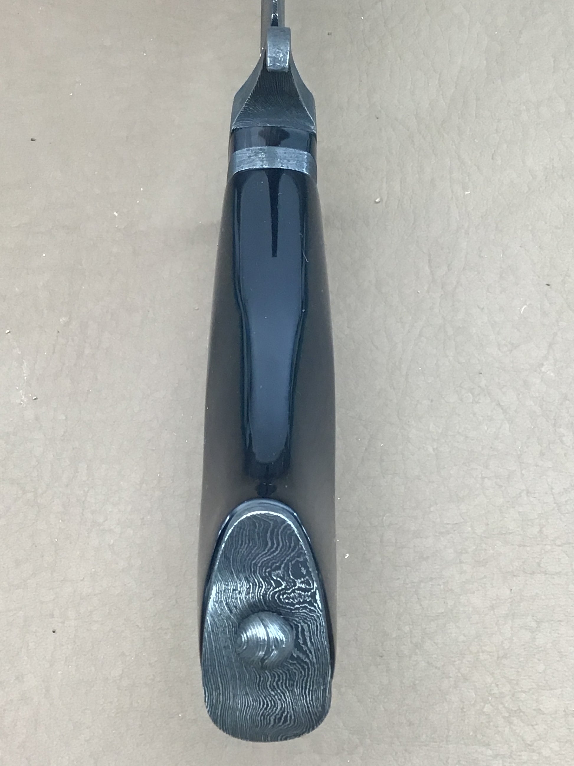 This **Recurve Bowie** is a striking example of Jim’s craftsmanship — a perfect blend of strength, beauty, and traditional American design. The blade is forged from **1084 and 15N20 Damascus steel**, producing a bold pattern and excellent cutting performance. Its **Buffalo Horn handle** adds both durability and visual depth, while the **matching Damascus guard and pommel** complete the cohesive, handcrafted aesthetic.